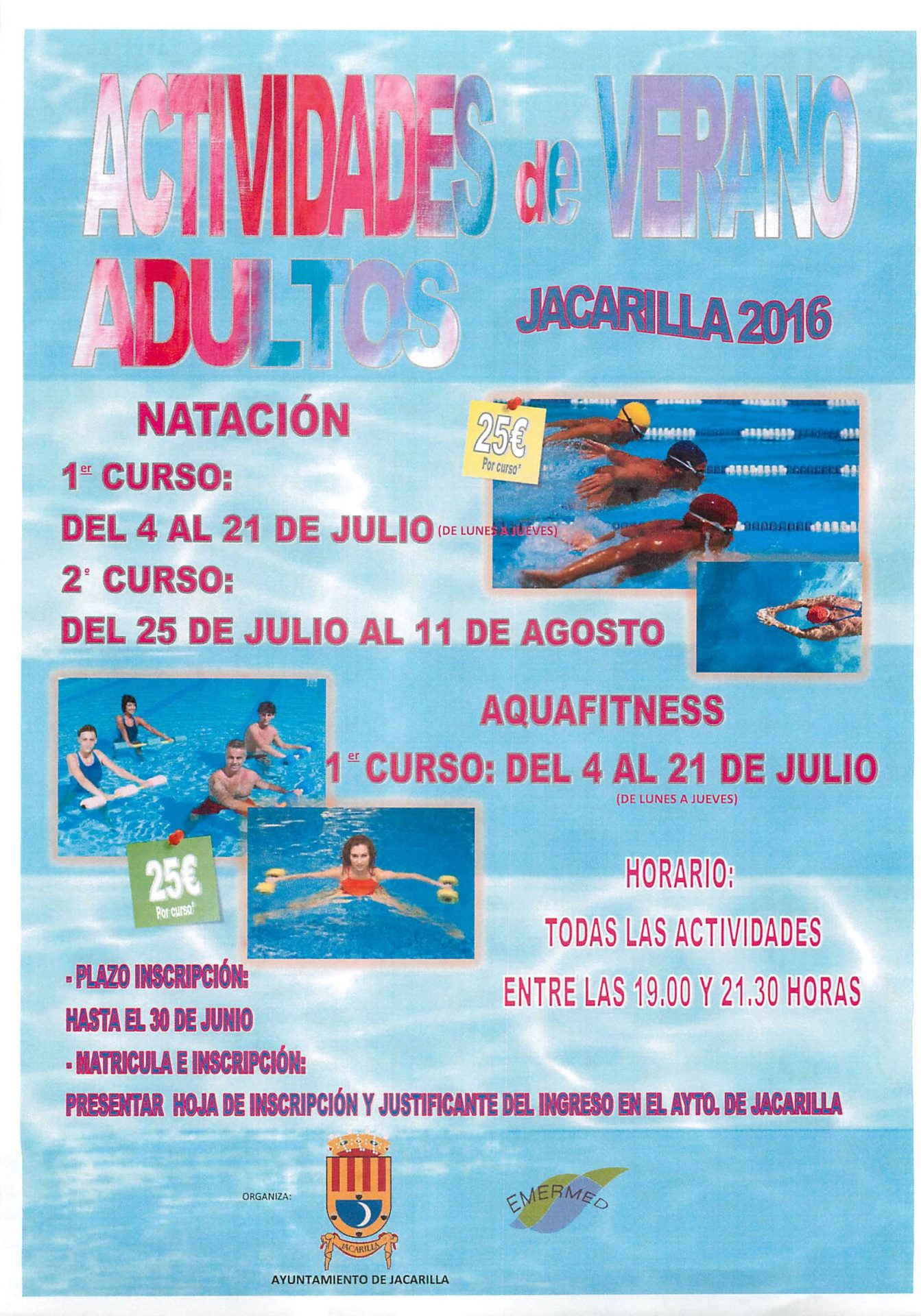 Por la presente informar que está abierto el plazo de inscripción para las actividades de verano para adultos, Natación y Aquafitness. Los cursos se impartirán de lunes a jueves en horario de 19.00 a 21.30 horas. Las actividades se impartirán si existen un mínimo de inscripciones.
