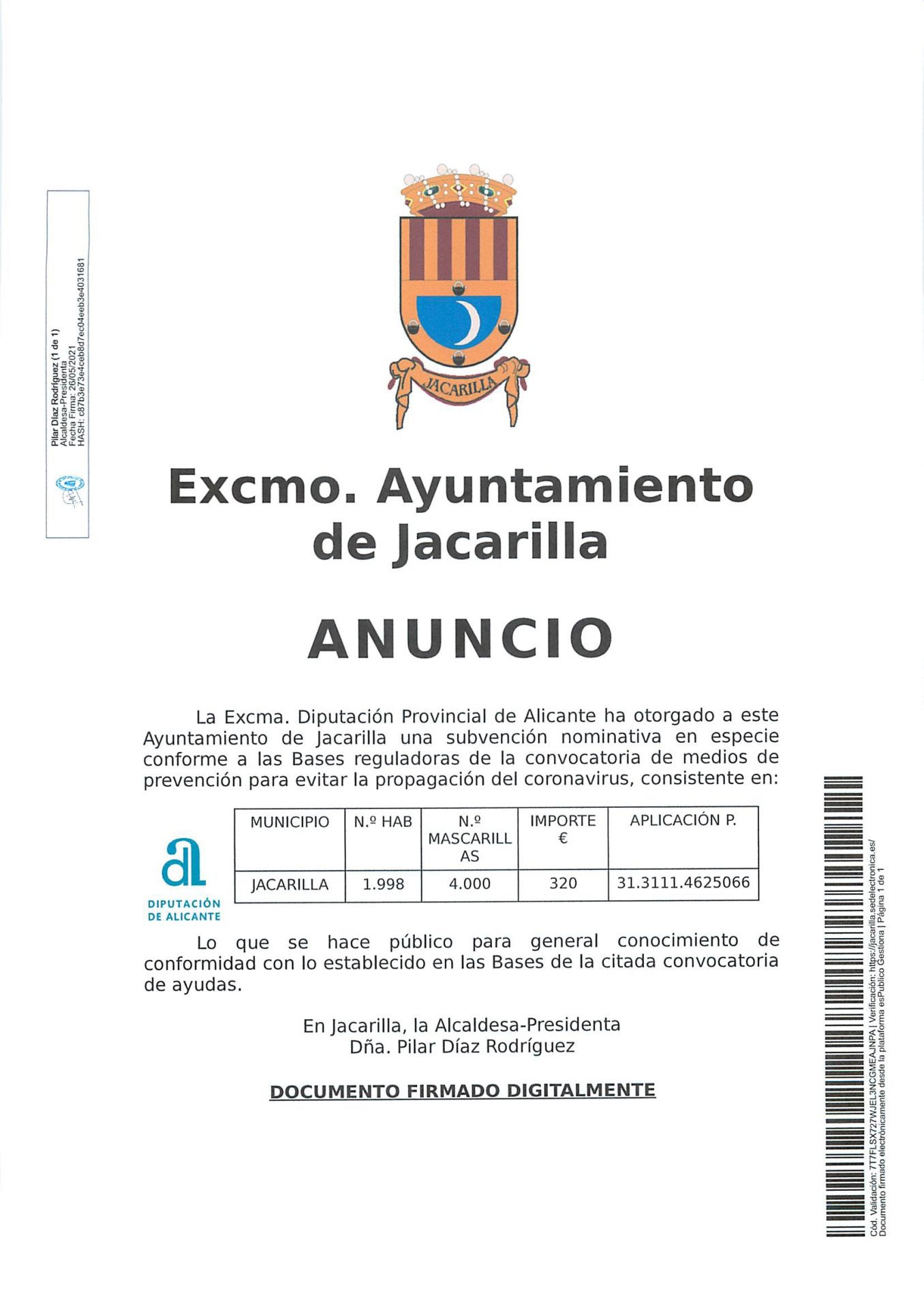 La Excma. Diputación Provincial de Alicante ha otorgado a este Ayuntamiento una subvención nominativa en especie, conforme a las Bases reguladoras de la convocatoria de medios de prevención para evitar la propagación del coronavirus, consistente en: