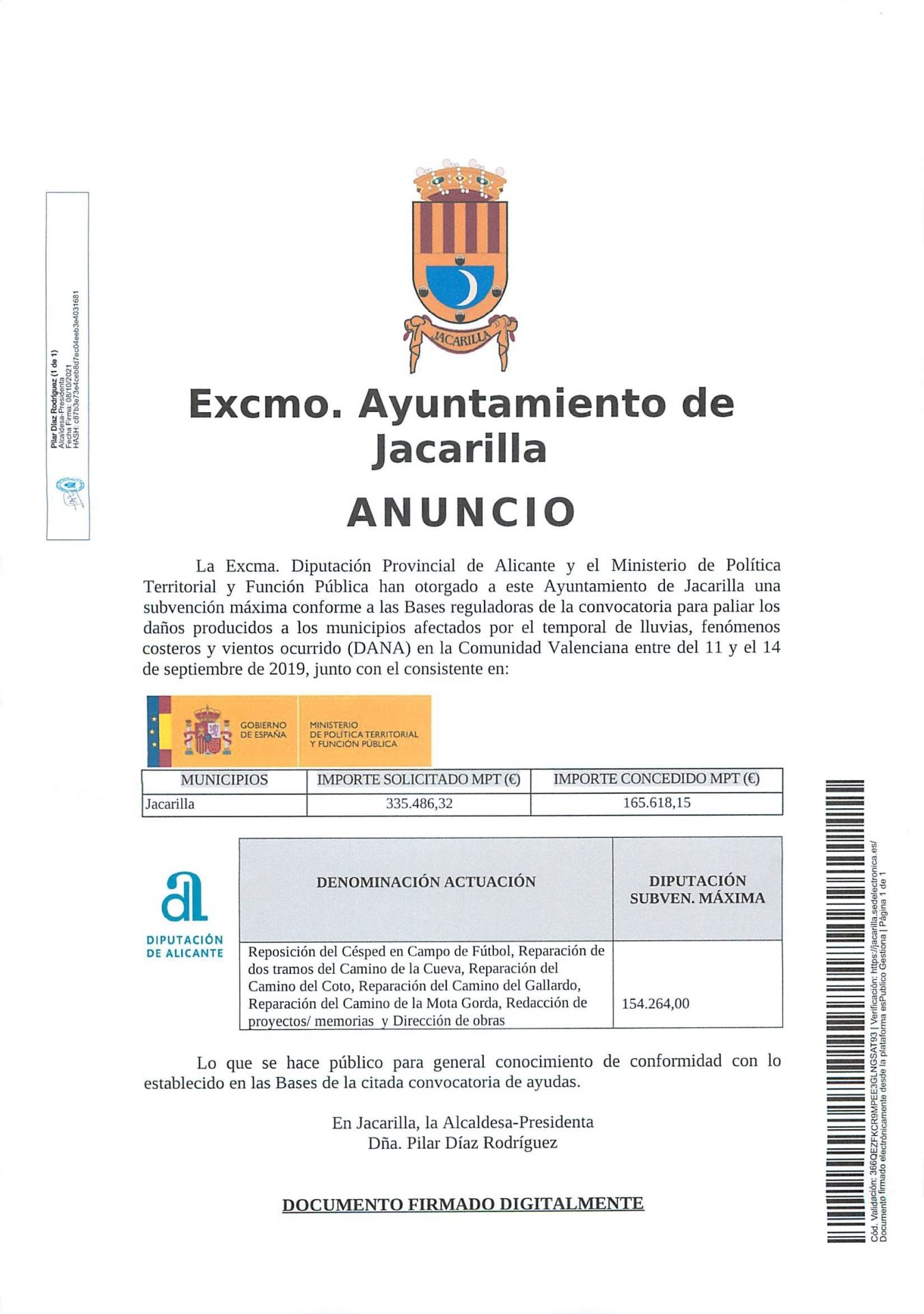 La Excma. Diputación Provincial de Alicante y el Ministerio de Política Territorial y Función Pública han otorgado a este Ayuntamiento de Jacarilla una subvención máxima conforme a las Bases reguladoras de la convocatoria para paliar los daños producidos a los municipios afectados por el temporal de lluvias, fenómenos costeros y vientos ocurrido (DANA) en la Comunidad Valenciana entre del 11 y el 14 de septiembre de 2019, junto con el consistente en: