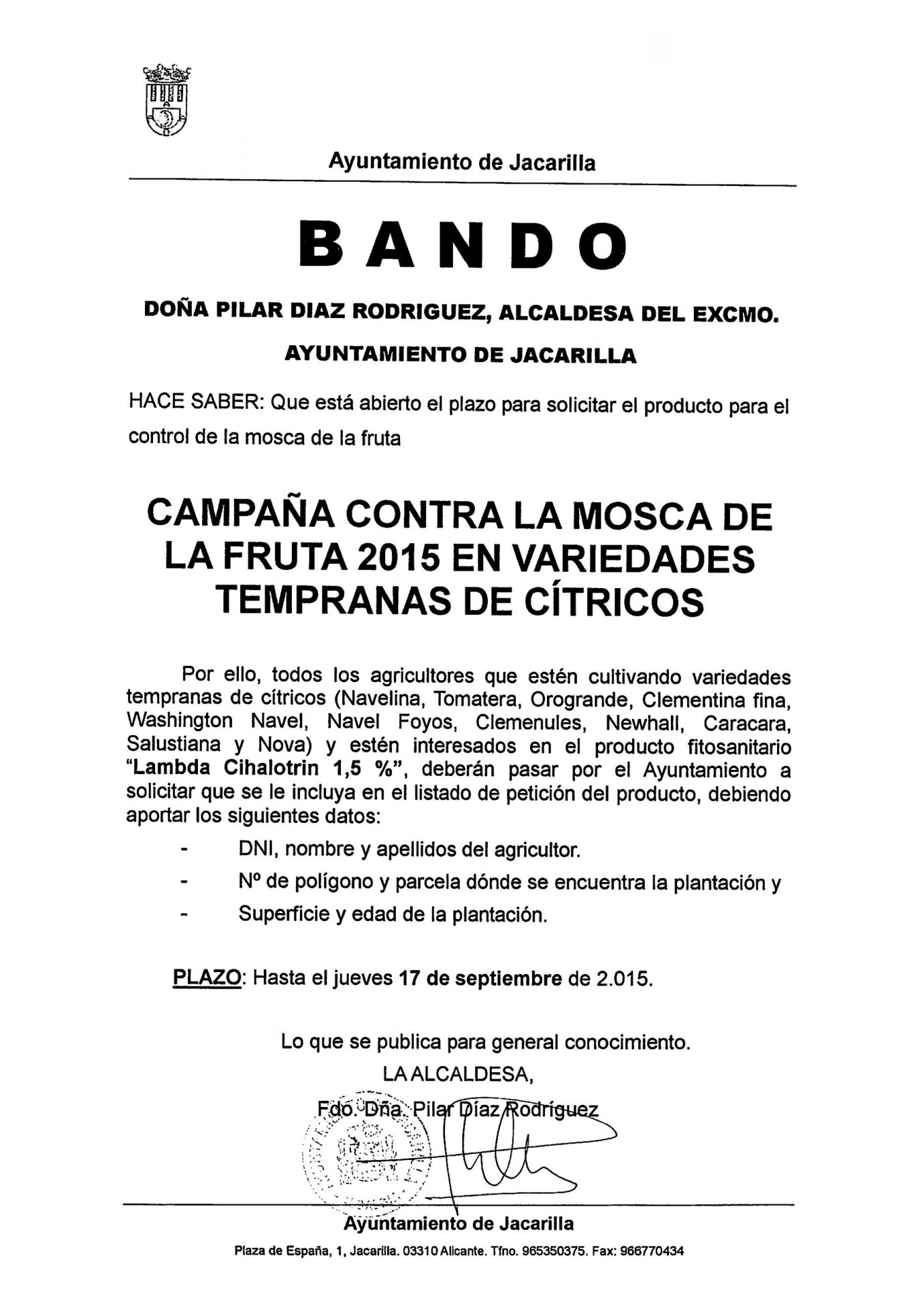 El Ayuntamiento de Jacarilla informa que está abierto el plazo para solicitar el producto fitosanitario contra la mosca de fruta en las variedades tempranas de cítricos.