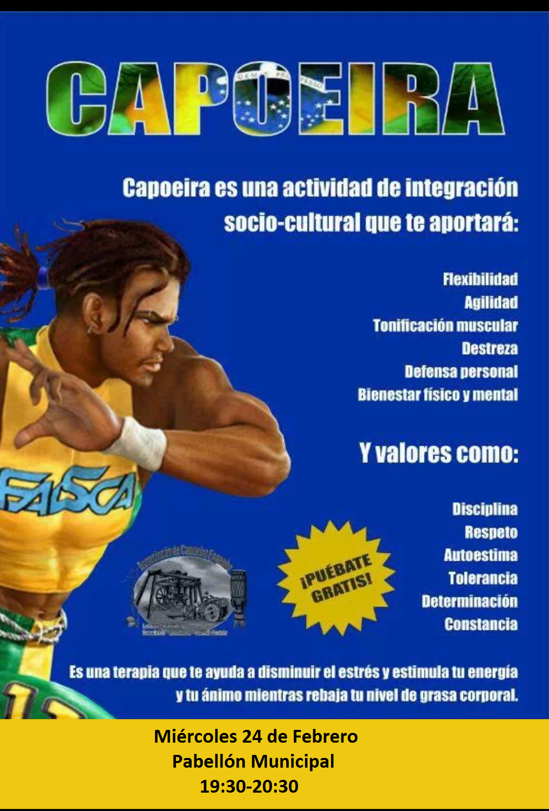 El próximo miércoles 24 de febrero, de 19.30 a 20.00 horas, en el Pabellón Municipal, tendrá lugar una exhibición gratuita de CAPOEIRA, que es una actividad de integración que combina facetas de danza, música y acrobacia. Ven a disfrutarla.