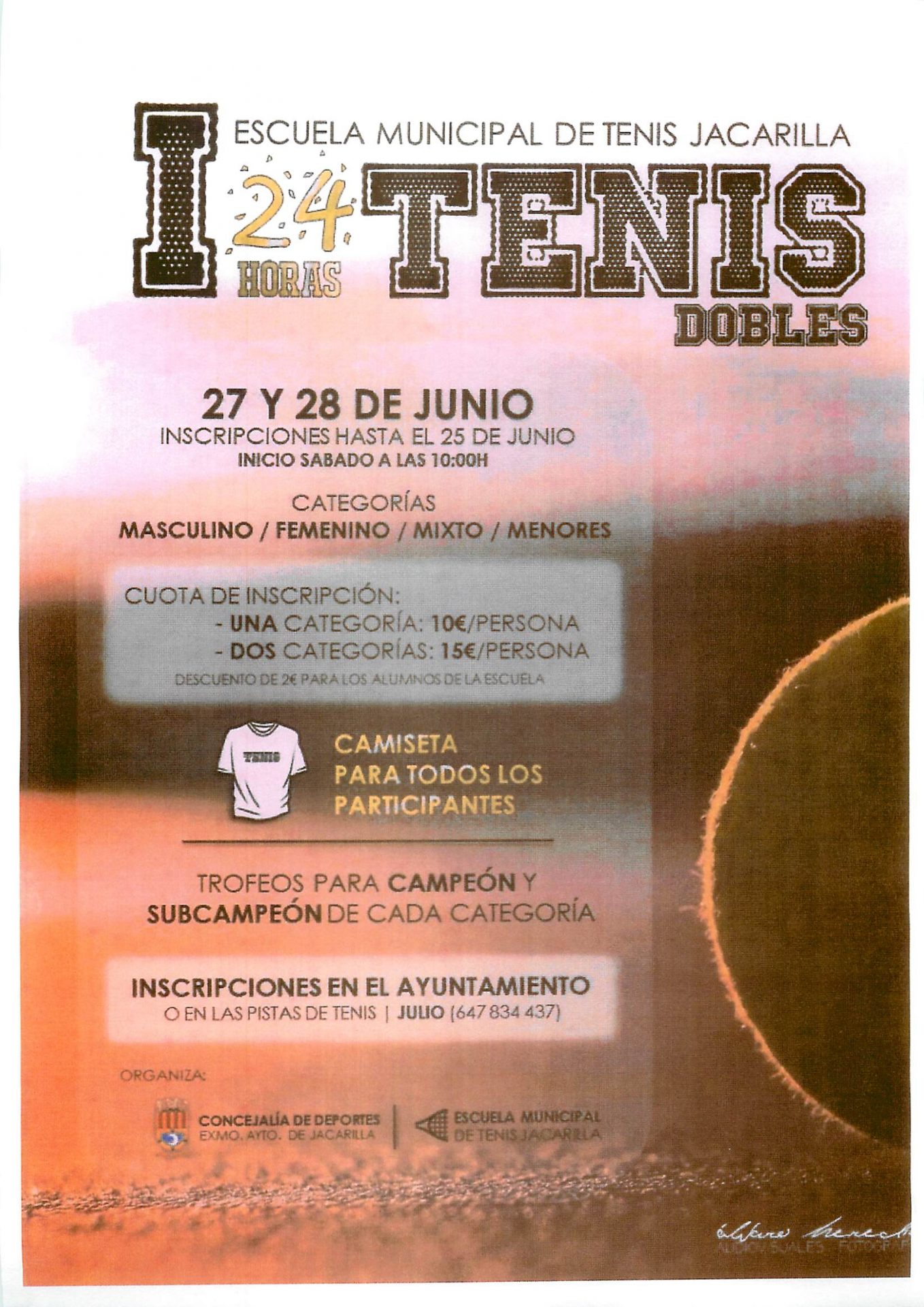 La Escuela Municipal de Tenis de Jacarilla y el Ayuntamiento de Jacarilla, organizan para este fin de semana 27 y 28 de junio y desde las 10.00 horas del sábado el primer torneo “I 24 HORAS TENIS DOBLES”. Competirán las categorías de masculino, femenino, mixto y menores.CARTEL 24 HORAS DE TENIS