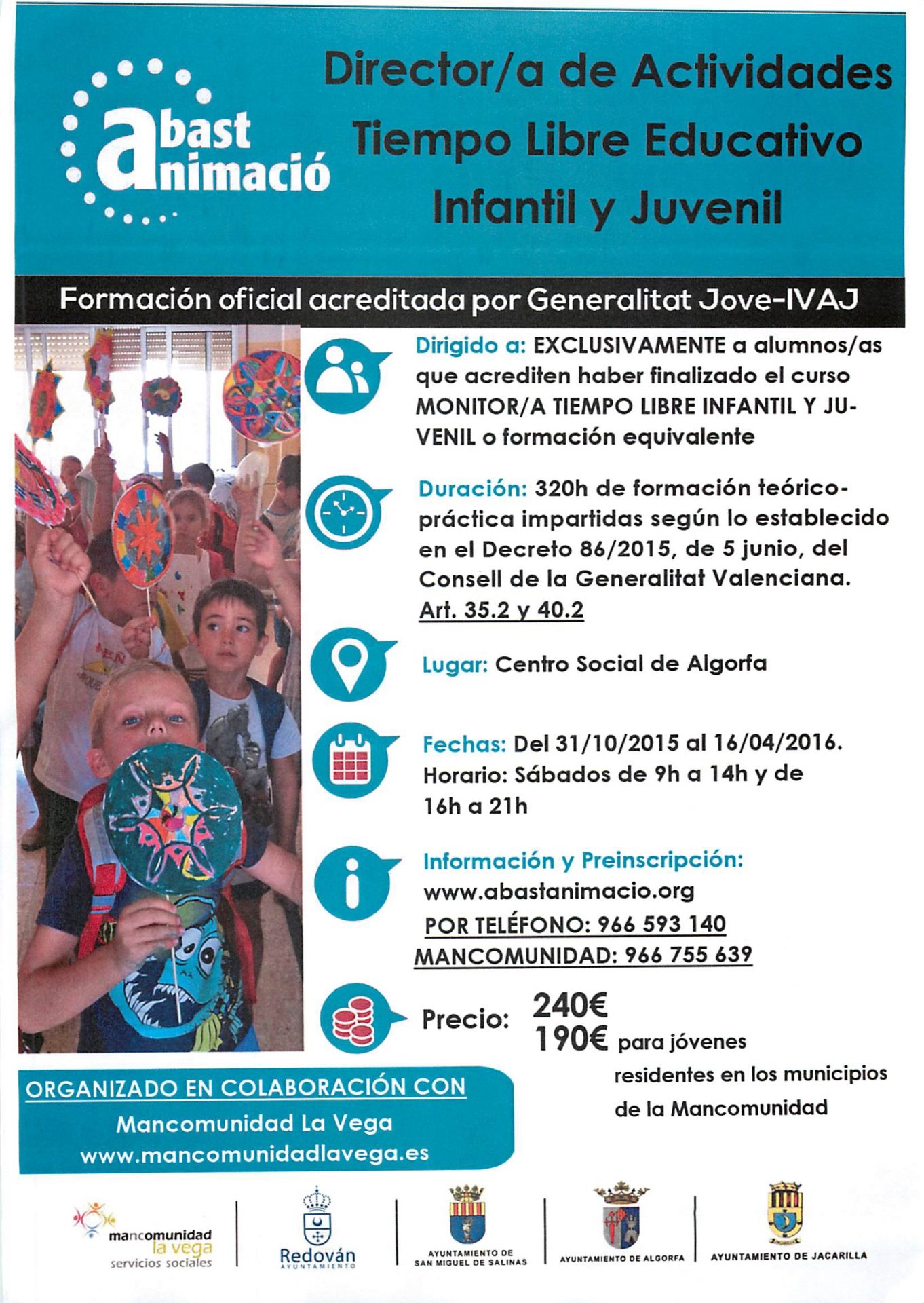 Desde el Ayuntamiento de Jacarilla, os informamos que las personas interesadas en realizar el curso de «Director/a de Actividades de Tiempo Libre Educativo Infantil y Juvenil», pueden ponerse en contacto con la Mancomunidad La Vega. Es requisito imprescindible acreditar haber realizado el curso de Monitor/a de ocio y Tiempo Libre Infantil y Juvenil.
