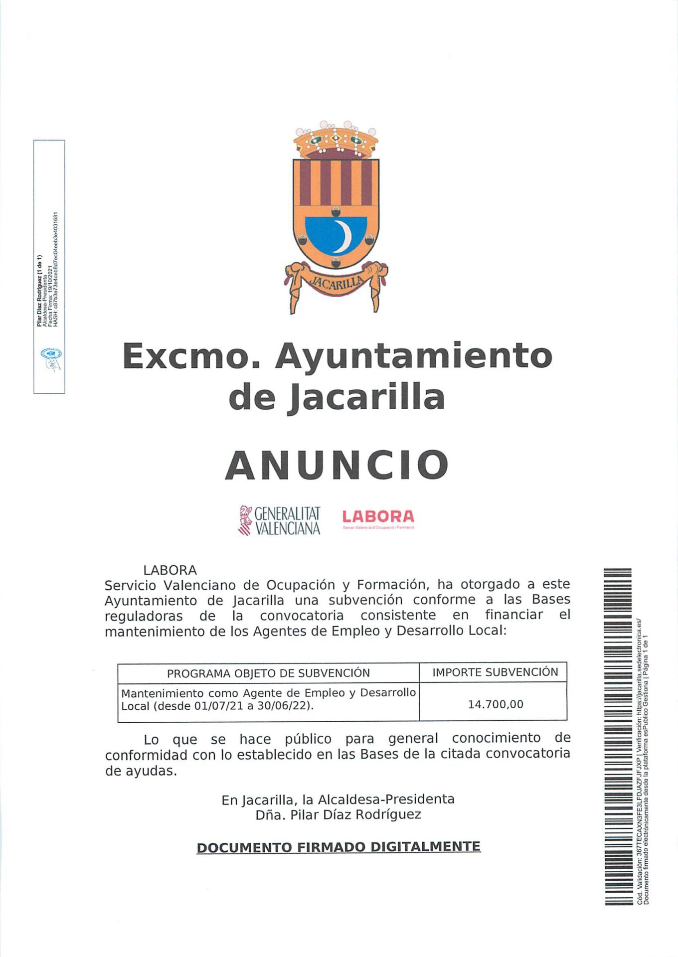 LABORA Servicio Valenciano de Ocupación y Formación, ha otorgado a este Ayuntamiento una subvención conforme a las Bases reguladoras de la convocatoria consistente en financiar el mantenimiento de los Agentes de Empleo y Desarrollo Local: