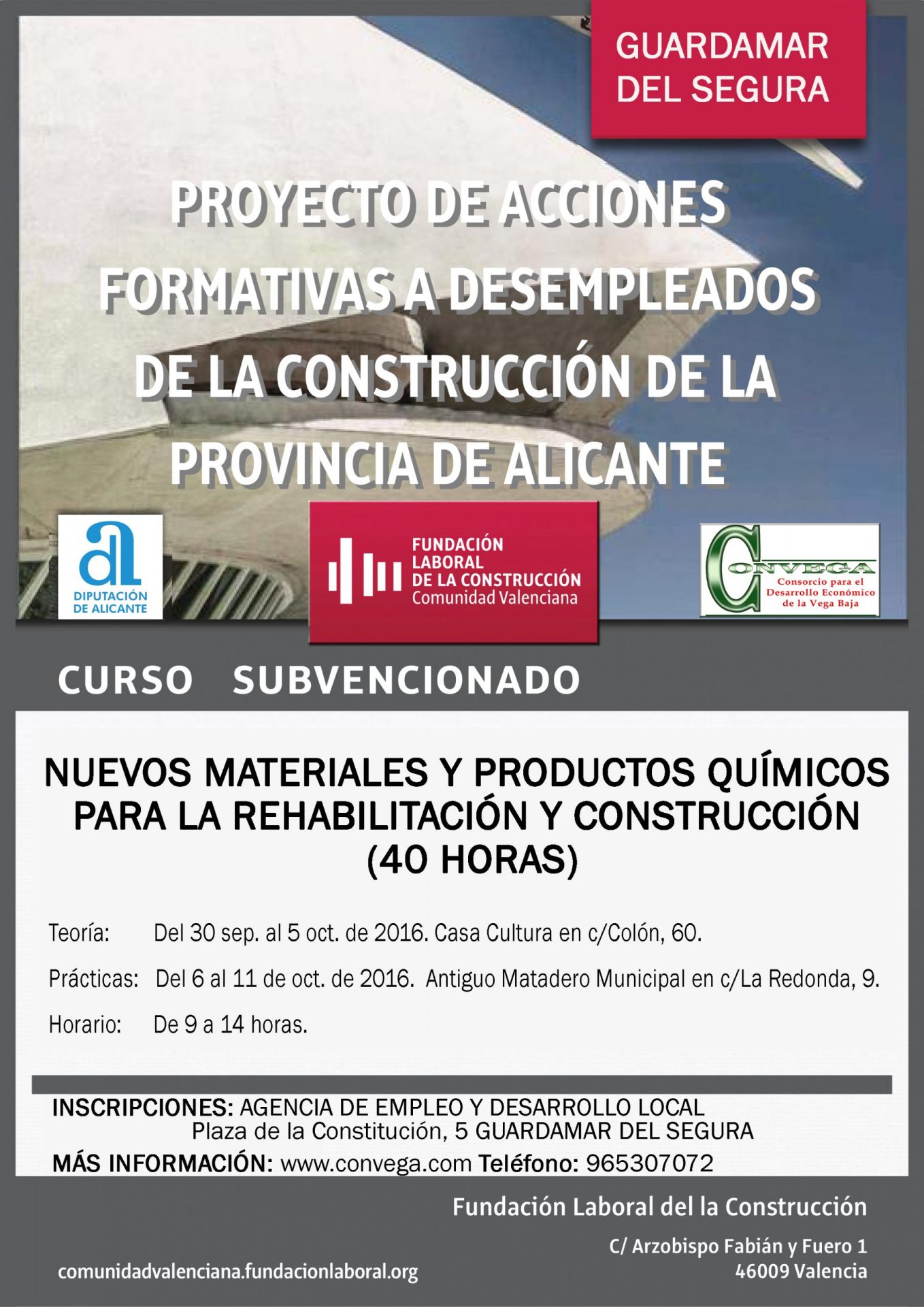La Excma. Diputación Provincial de Alicante, la Fundación Laboral de la Construcción y CONVEGA, ofrecen un curso gratuito de “Nuevos Materiales y Productos Químicos para la Rehabilitación y Construcción” dirigido a desempleados. El curso se impartirá en Guardamar del Segura. Mas info. 965 30 70 72.