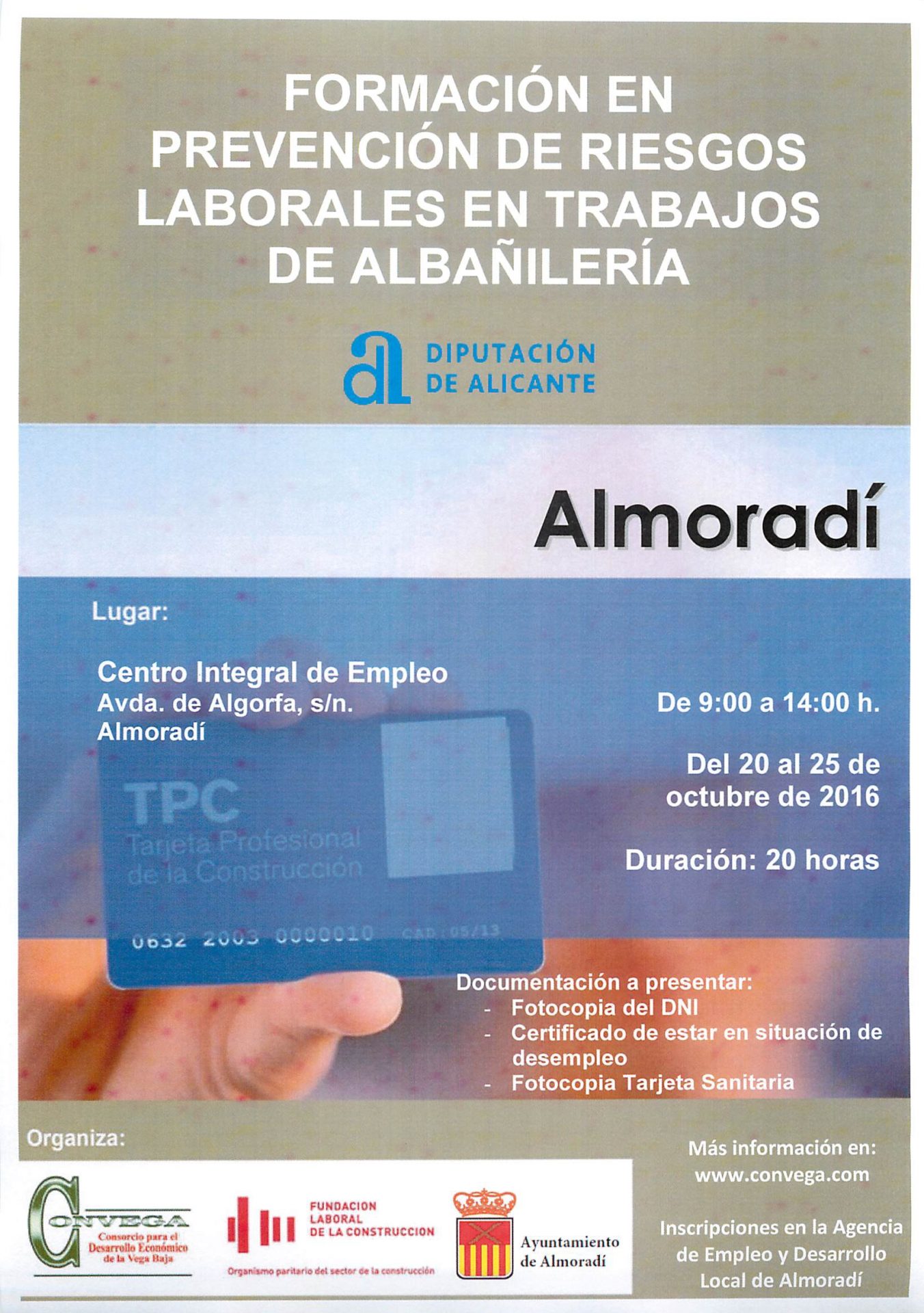 La Diputación de Alicante, CONVEGA, la Fundación Laboral de la Construcción y el Ayuntamiento de Almoradí, ofrecen el curso de formación en prevención de riesgos laborales en trabajos de albañilería a desempleados (TPC 20 HORAS).