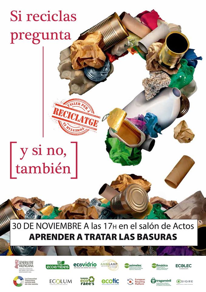 El próximo 30 de noviembre a las 17.00 horas en el Salón de Actos del Centro Social y Cultural, se realizará un interesante taller de reciclaje denominado “Aprende a Tratar las Basuras”. Os esperamos.