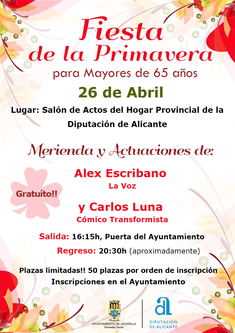 El martes 26 de abril en el Salón de Actos del Hogar Provincial de la Diputación de Alicante tendrá lugar una merienda y una actuación de Alex Escribano (La Voz) y de Carlos Luna (Cómico transformista). La salida está prevista a las 16:15 en la puerta del Ayuntamiento y el regreso a las 20:30 aproximadamente. Si eres mayor de 65 años puedes inscribirte en el Ayuntamiento. Las plazas son limitadas (50 plazas). GRATUITO.